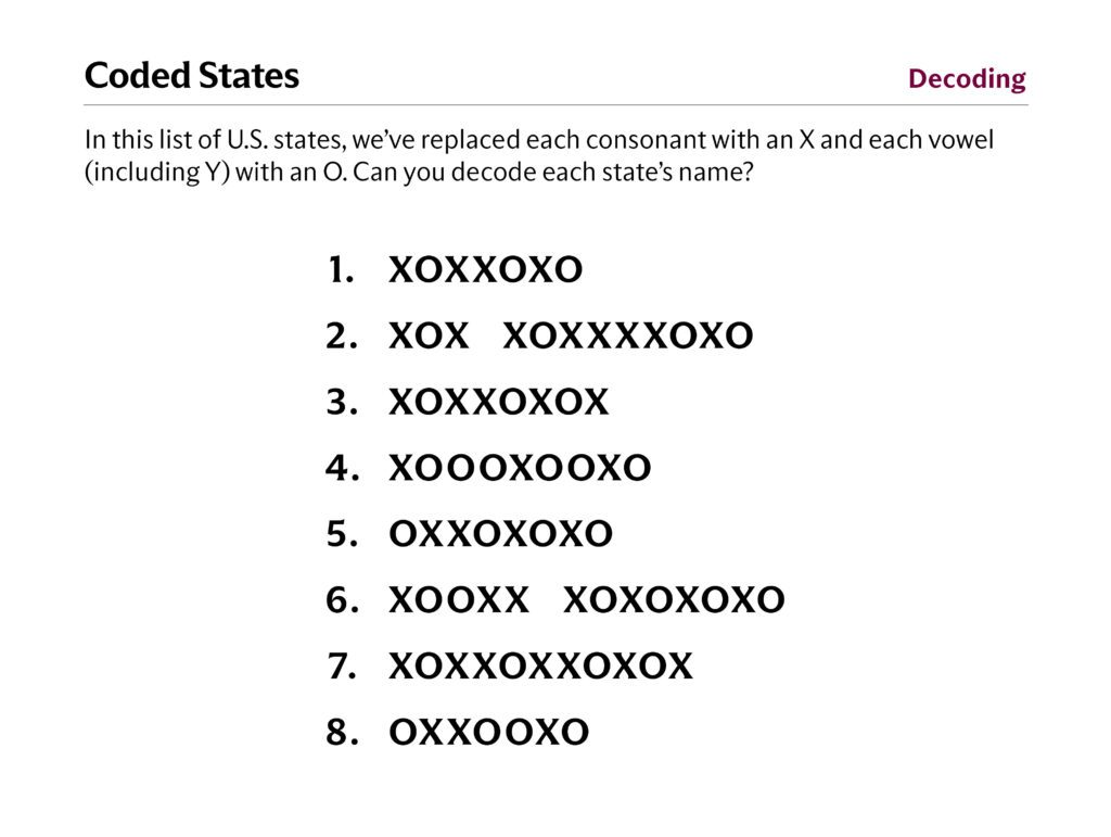 So why not combine these two beloved pastimes and try to solve our brain teaser, “Coded States”? In this puzzle, we’ve made a list of the names of eight U.S. states, replacing each consonant with an X and each vowel with an O. It’s up to you to study the list of states to figure out which coded line corresponds with which state.